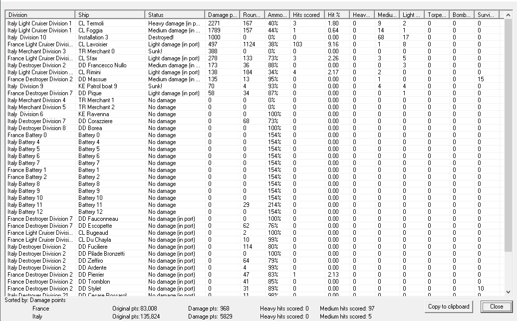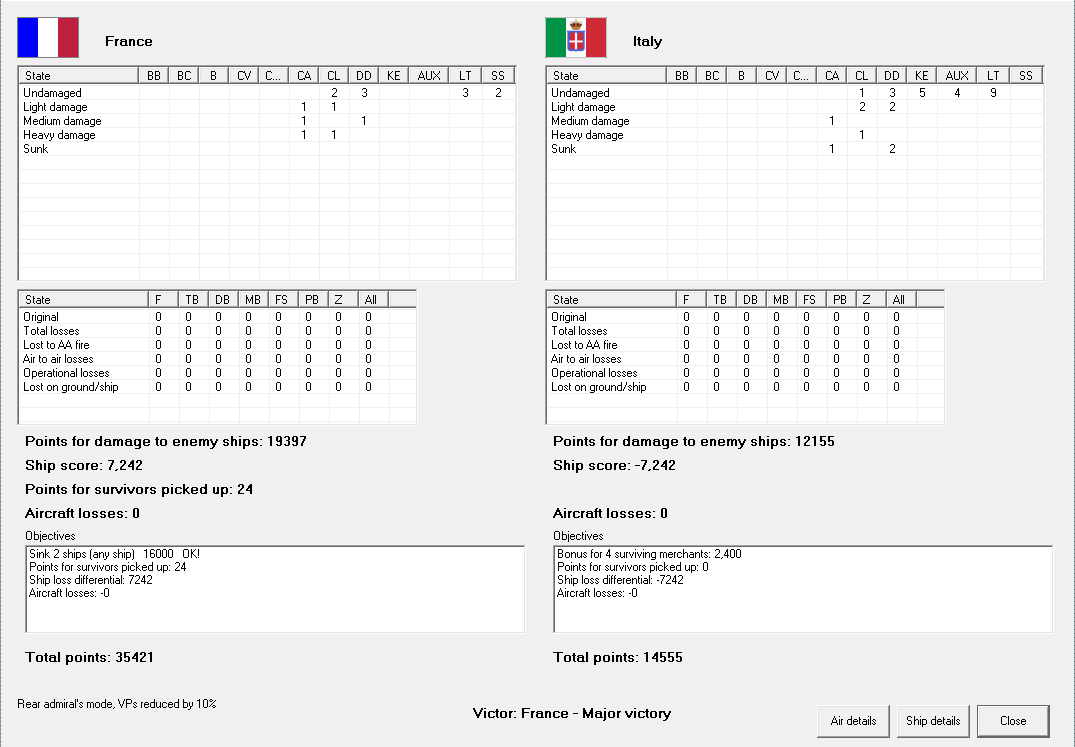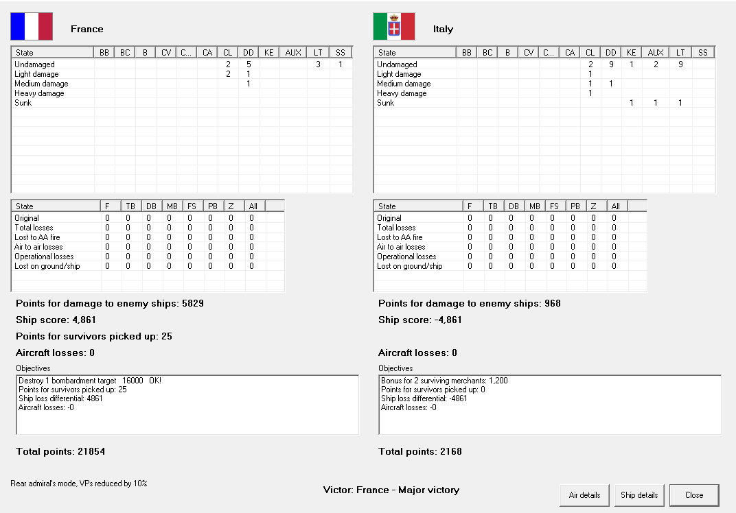 The Italians again decline the chance for a fleet battle off Sicily, giving us 1200 VP. They also decline to attack a convoy, giving us 7755 VP. Lastly, we launch a coastal raid on their east coast, with CL Lavoisier and some destroyers going in to destroy a bombardment target. They run into a group of Italian CLs and DDs, which they brush aside on their way to destroying the target. The force then withdraws towards the British ports in Dalmatia, destroying a KE on the way. A destroyer that got separated from the force picks off a transport. A covering force (AI controlled) took some damage, but it's still a major victory at the Battle of the Gulf of Manfredonia, netting us 1,519 VP and 1 prestige, 227 VP for them.