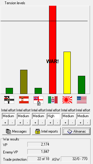 We are at war with Italy for a third time so far this century. Not much has changed in the 18 months since the last one ended, except that we have commissioned a pair of new battleships, while Italy still has only one Irresistible-type. As such, we currently plan to essentially implement the strategy we used last time. We have solved most of the bottlenecks that kept our forces out of Sicily, and after a minor victory in the opening battle of the war, are prepared to fight for control of the Mediterranean.