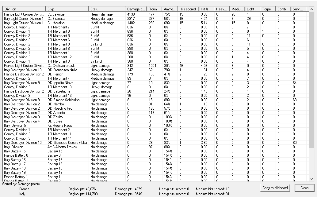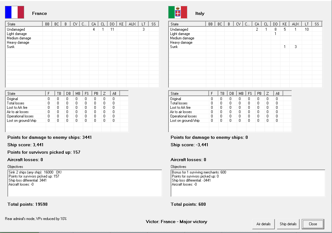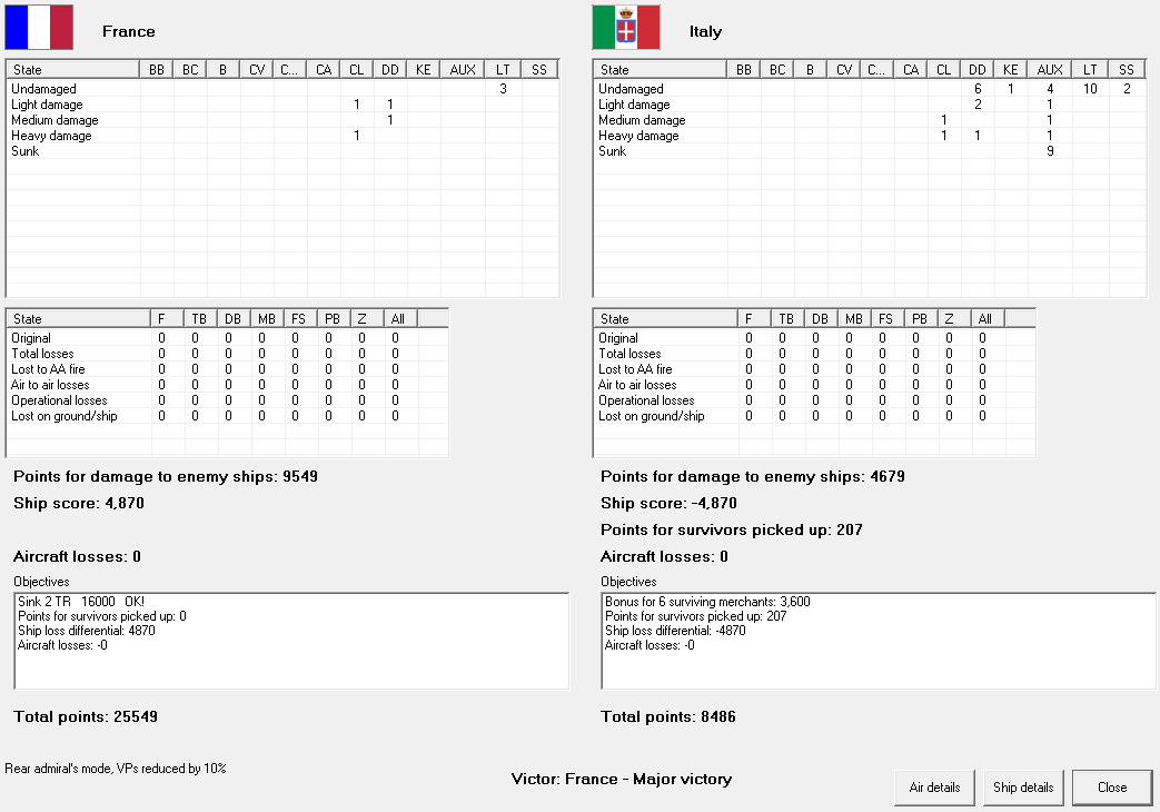 Convoy attack off Libya. 2 CLs and 2 DDs run into a pair of enemy CLs, but manage to fight their way through them to close on the convoy. A number of transports are sunk, although their cruisers catch up and drive us off before we can make a clean sweep. CL Lavoiser is damaged, but survives, as do all of the escorts. Overall, the Battle of Sfax is a major victory, 1,764 VP for us, 673 VP for them, +1 prestige.