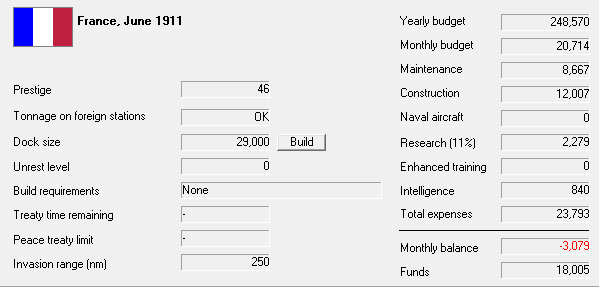 It looks like our budget deficit is roughly the construction cost of one capital ship, so I'd probably not lay down another Lille until both the Bouvets are done. To save money until then, follow up the Du Chaylas with either the destroyers you suggested, or those cheaper trade protection cruisers you talked about earlier. Could we afford to put the Friedlands into reserve too?