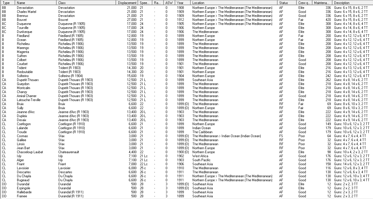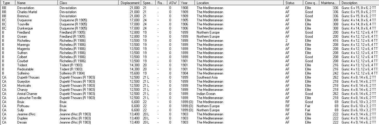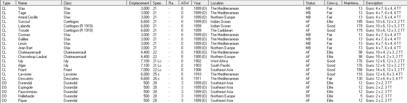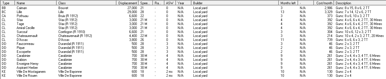 A question on the cruiser composition. We basically have three options. First, the standard fleet cruiser (Du Chayla is the latest in this line). Second, the long-range colony cruiser (Isly/Friant). Lastly, the trade-protection cruiser (D'Assas). That one is significantly cheaper (an extra four destroyers over the 20-month period). Which do we want to build?
