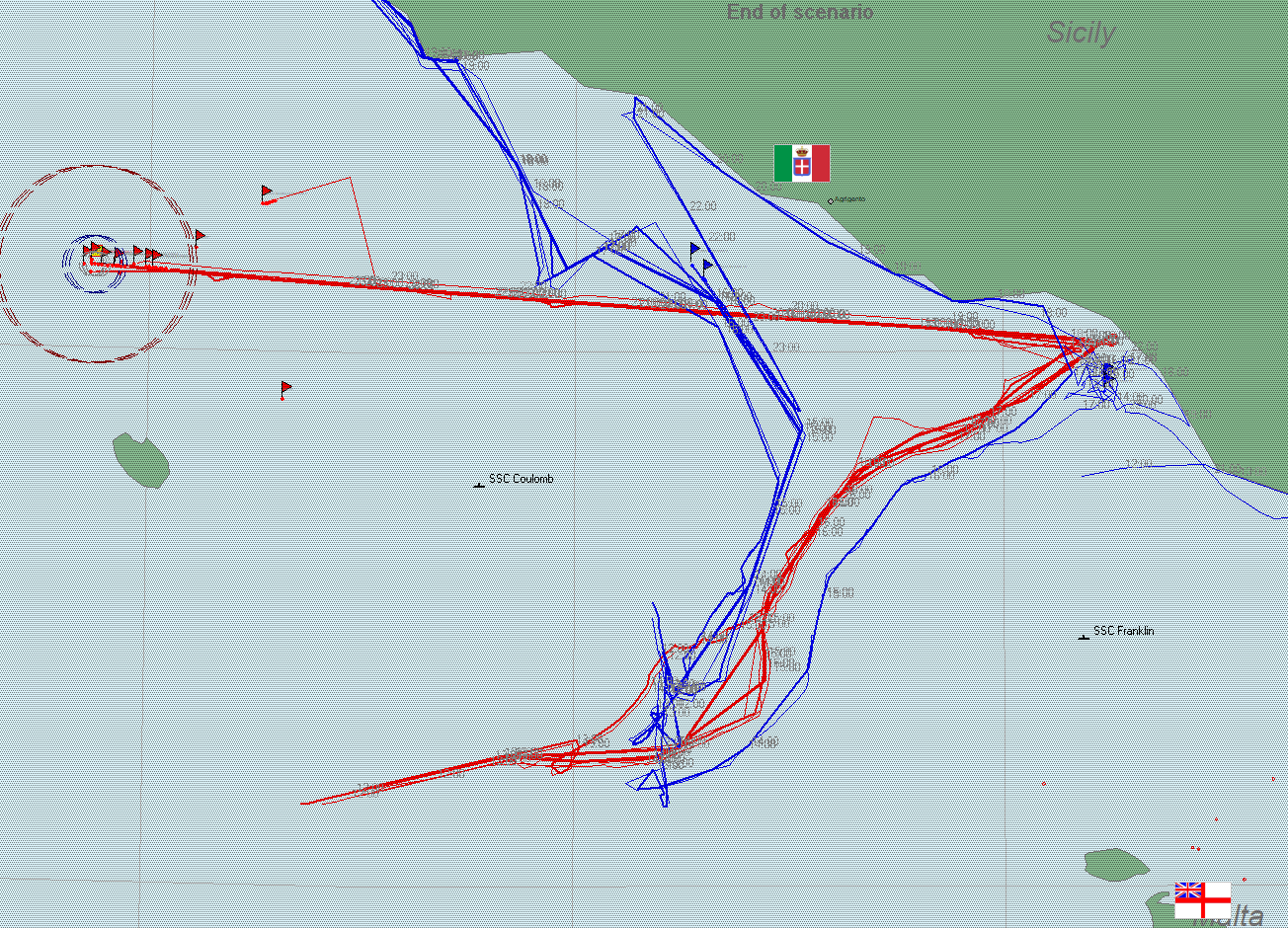 Battleship engagement in the Straits of Sicily. 3 BB, 3 B and 3 CA encounter an enemy force of 3 CAs and quickly set off in pursuit. They manage to pound one of them, which later sinks, and damage the other two before darkness conceals the ships and they break off back to Tunisia. As the enemy retires, one of our subs torpedoes and sinks a second CA. Major victory at the Battle of Sicily, 1,926 VP for us, 149 VP for them.