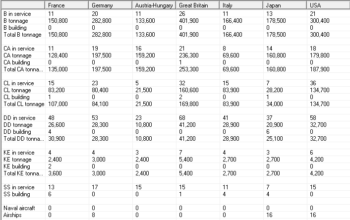 CL D'Assas laid down. Private shipbuilding increases max dock size by 500 tons. 2 DDs finish reconstruction. Italy commissions 4 DD, Japan 1 DD.