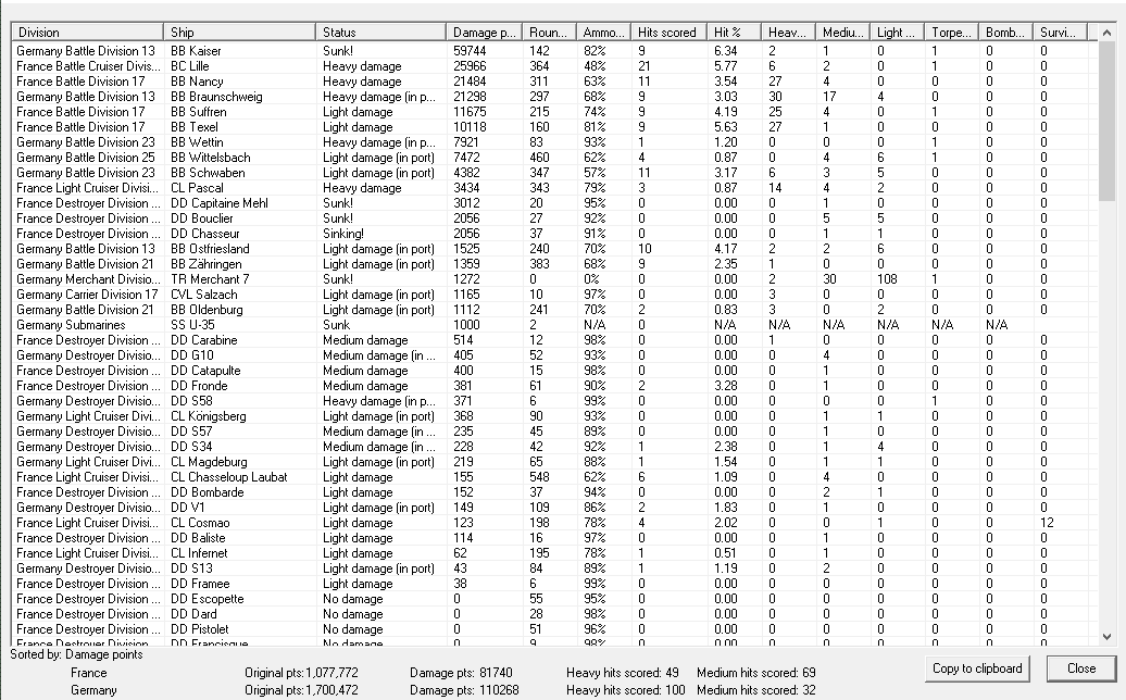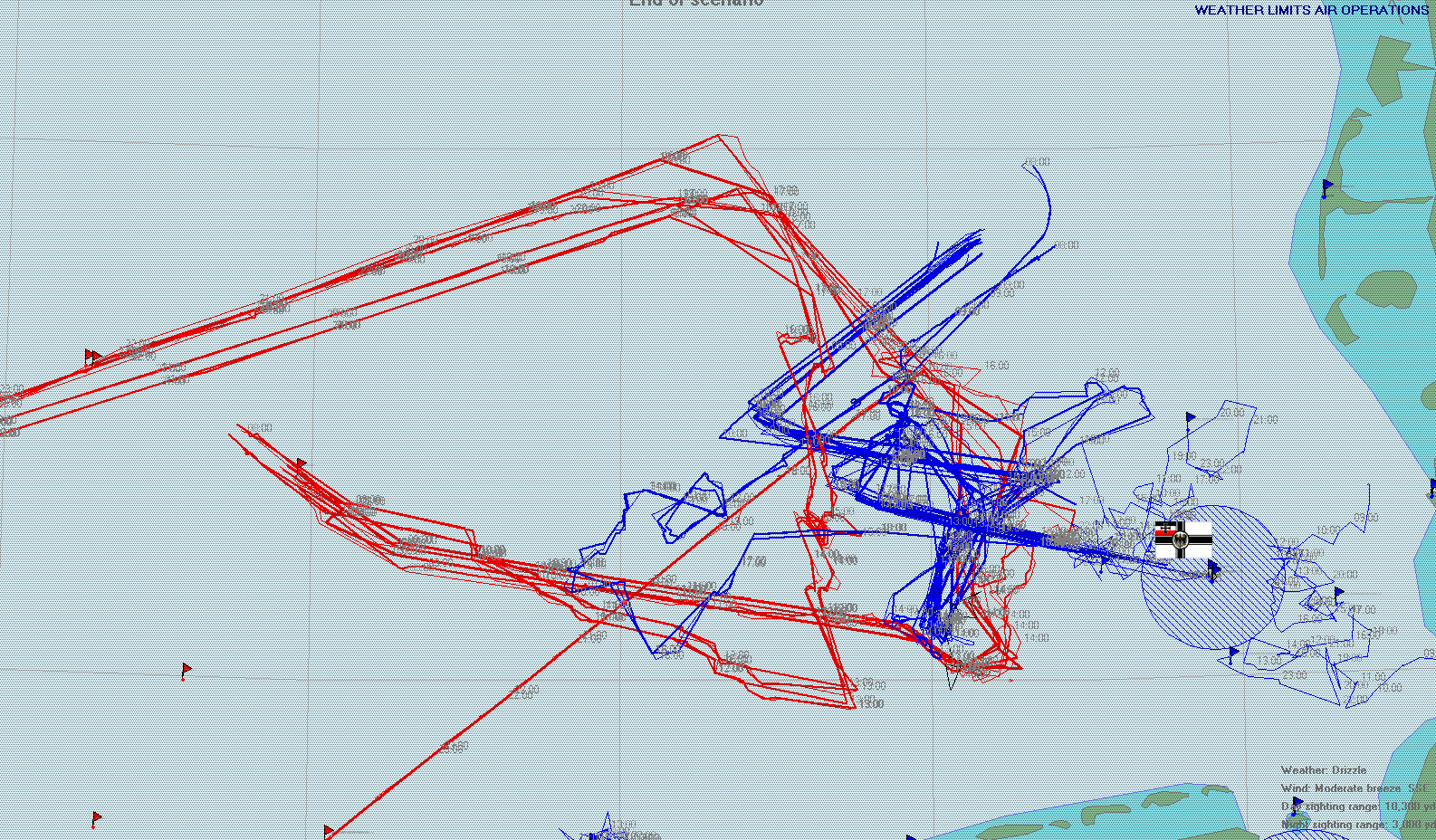 Raid on enemy coastal shipping in the German Bight. 1 BC, 3 BBs, 2 CVs and a CVL with escorts. Fortunately, bad weather means the German planes are unable to attack. Unfortunately, the Germans manage to get behind us, and we're forced to try to get around them. Despite some scary moments, we're reasonably successful at this, and on the way out, discover a German CVL within gun range. Unfortunately, dusk shrouds it, but not us from their battleships. The result is a long, running battle before full darkness falls. Several of our ships get rather beaten up, but we end up only losing three destroyers, while sinking a German battleship. The Battle of the German Bight is a minor victory for us, 7,565 VP vs 5,083 VP, +1 prestige.