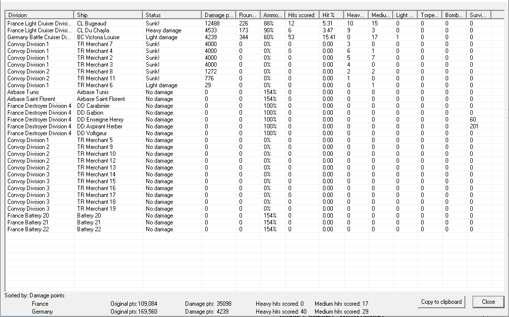 Convoy defense in the Med. 2 CL and 5 DD find themselves facing down a German BC. This goes about as well as you'd expect, particularly because their torpedo crews appear to be asleep. One CL is sunk, the other badly damaged, and six merchant ships are also on the bottom. 3,277 VP for Germany, 870 VP for us, -1 prestige from the Battle of Cape Tuelada.