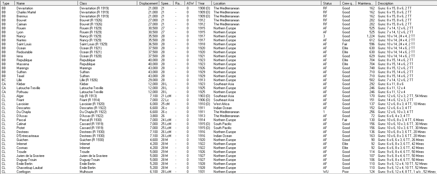 BBs and BCs - Retire the Devastations, and send Lille and the Rouens to the Med. I think we can wait a year or so before laying down more, but would be interested in seeing a 17" design.