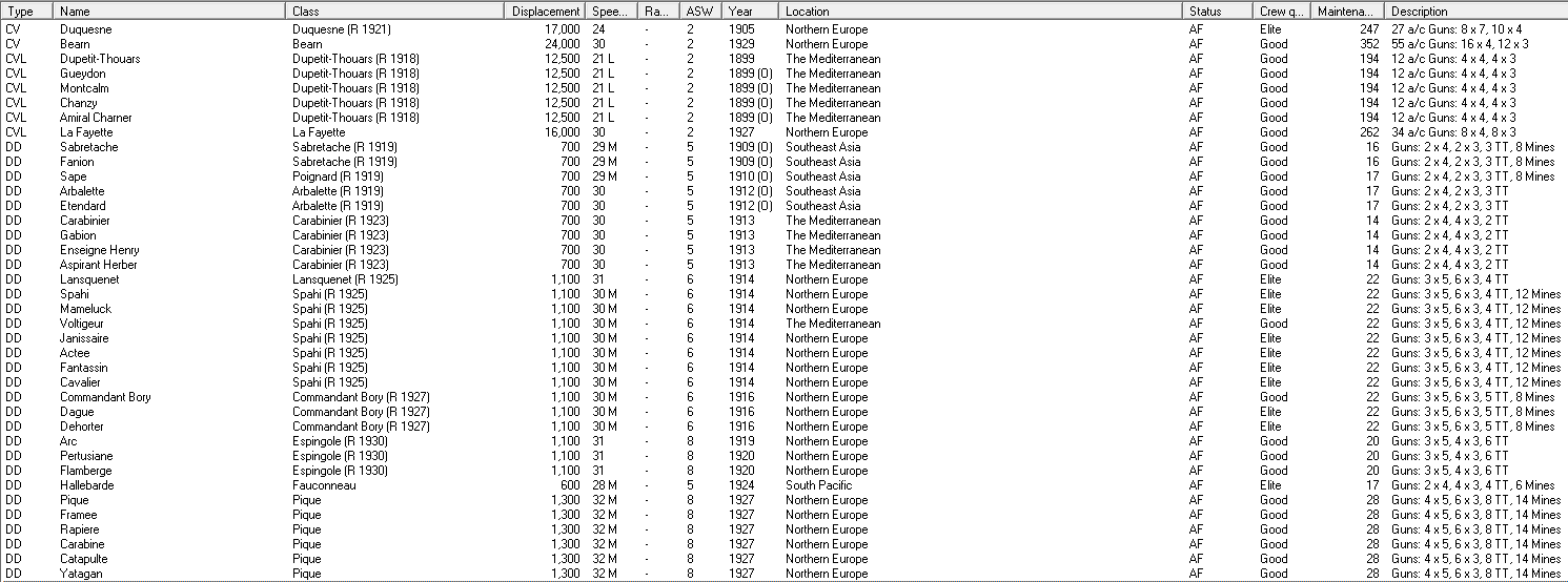 Destroyers - Retire the Sabretaches, Arbalettes and Poignard. Send the Carabiniers out to replace them. We'll want more DDs in a few years time, but I'm hoping that by waiting we might have 5" DPs to arm them with.