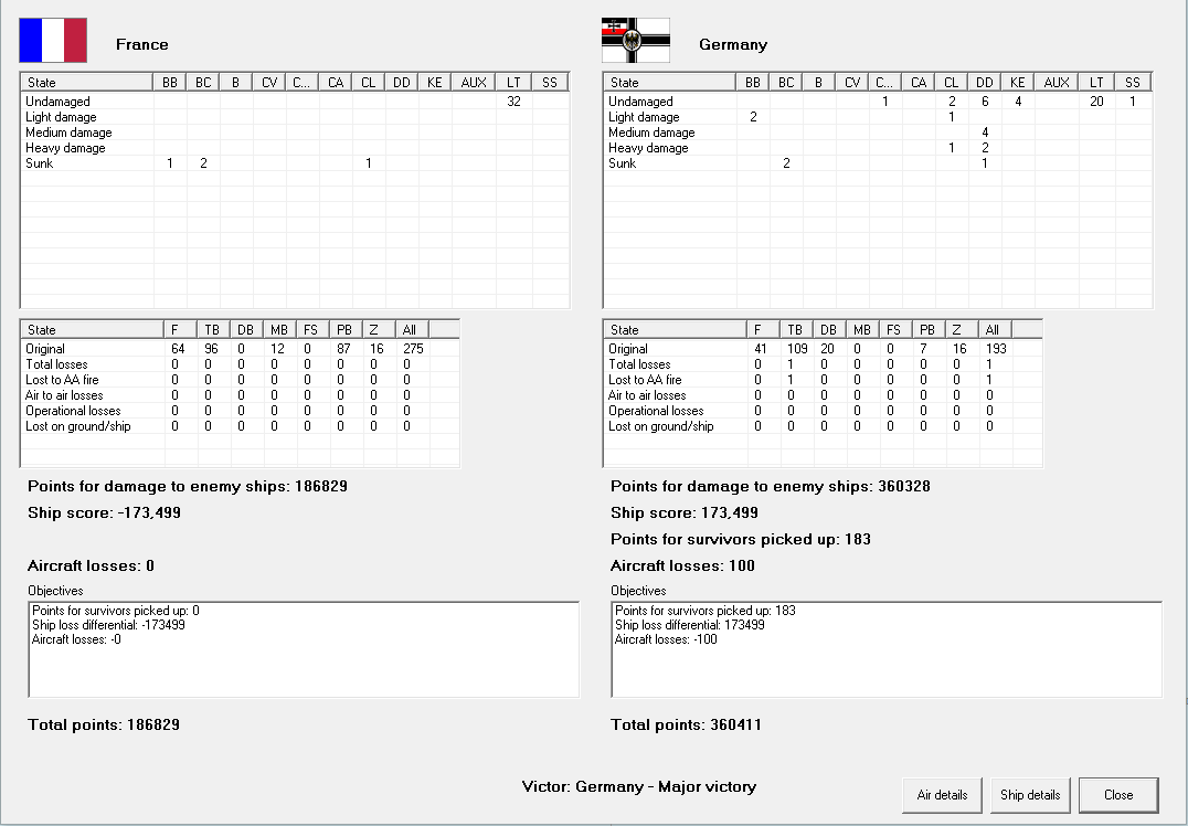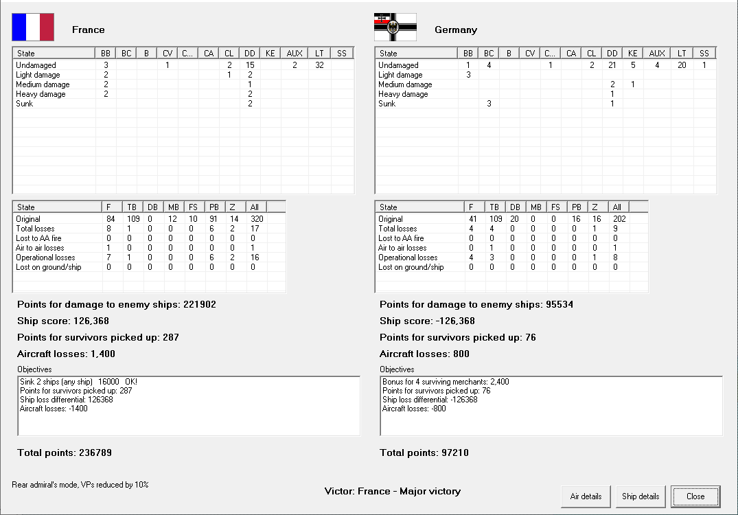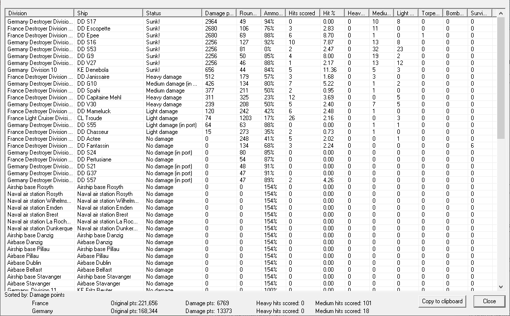 CA Latouche-Treville intercepts a German raider off Brittany. It turns out to be a CL, which takes the first 11" hit in the opening moments of the engagement. Our ship quickly gains the upper hand, pounding the CL. It sinks after a 75-minute engagement. It's a major victory for us, 1093 VP to 58 VP.