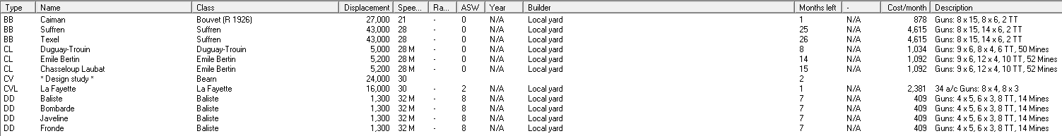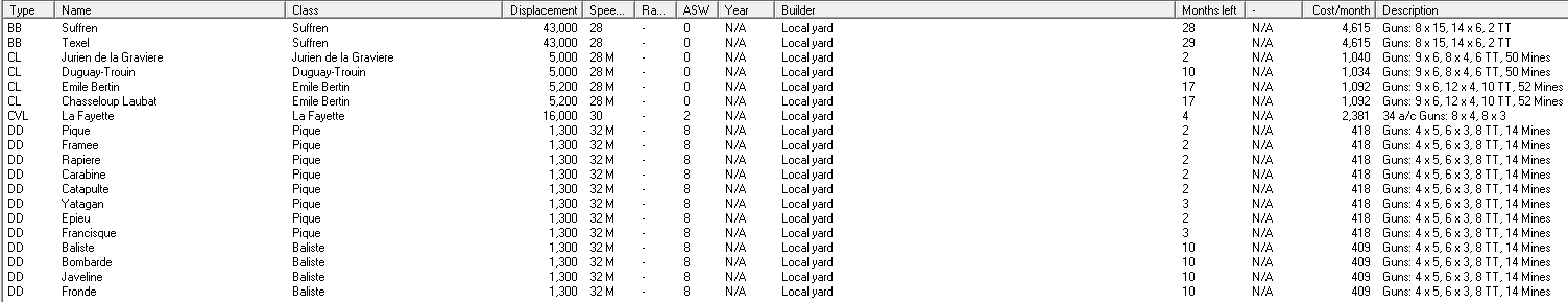 In the past six months, we've laid down two battleships, 2 CLs and a quartet of destroyers. We have ships about to commission as well, 8 destroyers, a CVL and a CL. What will replace them is an open question, although after serious losses to air attack off the German coast, the staff would suggest an emphasis on carriers.