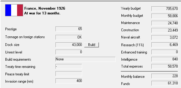 Unfortunately, even a reasonably healthy budget is a major step down from what we had in wartime, and we will have to make hard choices. After some initial mothballing, we will balance the budget next month when La Fayette commissions, but we will need to make further cuts if we want to lay down significant new construction, such as Bearn, or more new destroyers. We have recently made advances in that area allowing us to have twin turrets, and the staff would propose a design with four twin 4" turrets.