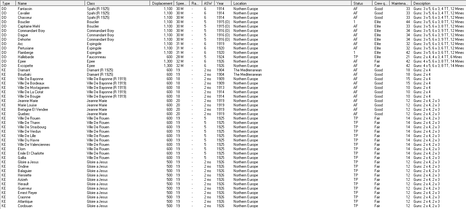 CL Jurien de la Graviere commissions, along with 6 new destroyers. Our spies steal plans for the Italian BC Regina Elena. Breakthroughs: Secondary director for CL, Double gun mounts on DD, Triple turrets on CL. (This is weird, because we've been doing that for years.) BC Nantes hits a mine and will be in dockyard hands for 2 months. One of our mines sinks German AMC Stella. Our subs sink 2 merchies for 1 loss, while their raiders get 3 of our ships. Germany lays down 2 DD and 3 KE, the UK 1 DD, Italy 1 KE, Japan 1 CL. Germany commissions 5 KE, Italy 2 KE, Japan 1 CVL. 210 VP for blockade. Design work begins on DD Escopette.