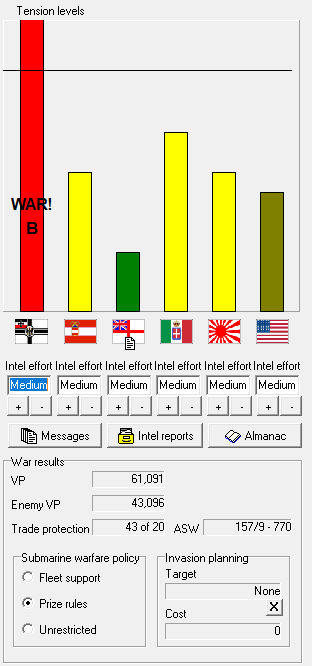 One of our submarines torpedoes and damages a German BB, while one of our KEs is sunk by a mine. We lose 7 merchants and 1 sub while sinking 2 of their merchies. BBs Suffren and Texel laid down. Germany lays down 1 CL, 1 AMC, Italy 2 KE, Japan 1 CA, US 1 BB and 1 CA. UK commissions a BC. 250 VP for blockade.