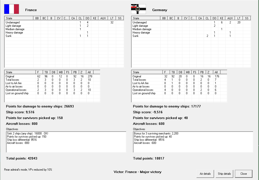We launch another coastal raid, which sees one of our CLs squaring up against 2 of theirs. An unlucky engine hit slows our ship, although the odds are evened when one of their ships brews up after a turret hit. We quickly gain the upper hand, and pound the other CL as well as several of their destroyers, although one of our destroyers takes a torpedo and goes down. We begin to withdraw, but air attacks on ships nearby (but not under my control) sink CL Lalande. Other nearby ships take out the second enemy CL while my force withdraws. Somehow, the result of the Battle of Borkum Riff is a major victory for us, granting one prestige and 2,734 VP as opposed to 1,333 VP for them.