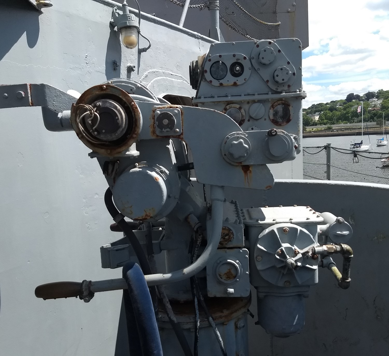 So did America contribute nothing to the field of light AA beyond mass production? Certainly not. At the beginning of the war, the typical light AA weapon was aimed by use of a ring sight, a simple device which gave the gunner some idea where to start with his aiming. Tracers would then hopefully let him walk his fire onto the target. A team at MIT under Charles Stark Draper was charged with developing something better.10 The result was the Mk 14 gunsight. This device used a pair of gyros to measure the rate of rotation of the sight as the gunner tracked the target. This rate was used to displace mirrors which gave the correct lead for the target, at least at close range.11 A second man was used to set the range on the sight. In addition to being mounted directly on the 20mm Oerlikon, the Mk 14 was fitted to a "dummy gun" and became the Mk 51 director, which was widely used for 1.1" and 40mm guns, and even linked to the 5" guns towards the end of the war, to attack surprise targets the Mk 37 couldn't track effectively.12
