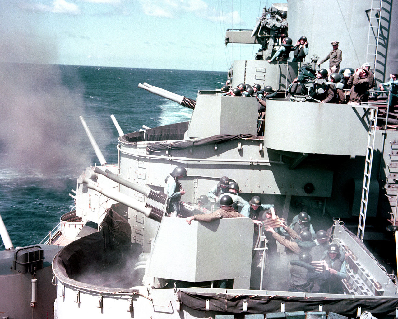 40mm guns in action aboard New Jersey. Note the 4-round clips being passed to the guns.