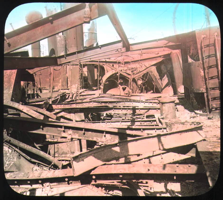 The wreck of Vizcaya. Note that the wooden weather deck, which would be overhead, has been burned away.