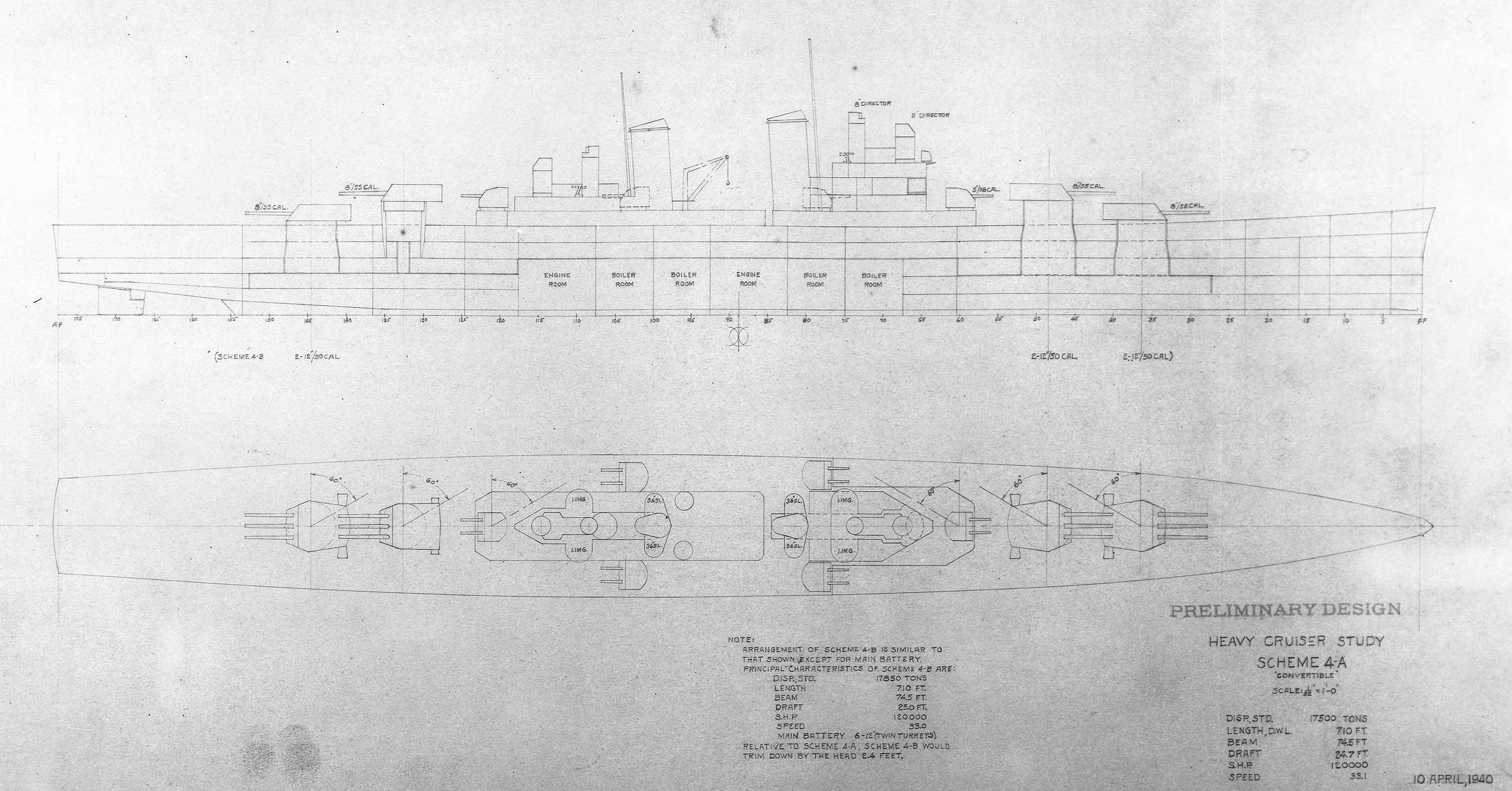 This decision was timely, as the fall of France to the Germans in June had opened the way for a major expansion of the USN. Previously, it had been assumed that the British would deal with the Germans, leaving the USN to worry only about Japan. Now, there was a real chance that Britain would fall, leaving the Germans in control of the combined fleets of Europe. Thus, on July 19th, America passed the Two-Ocean Navy Act, which authorized six of the new large cruisers. Detailed design began, and by the following May, enough weight was left over to replace the superfiring twin with a triple.