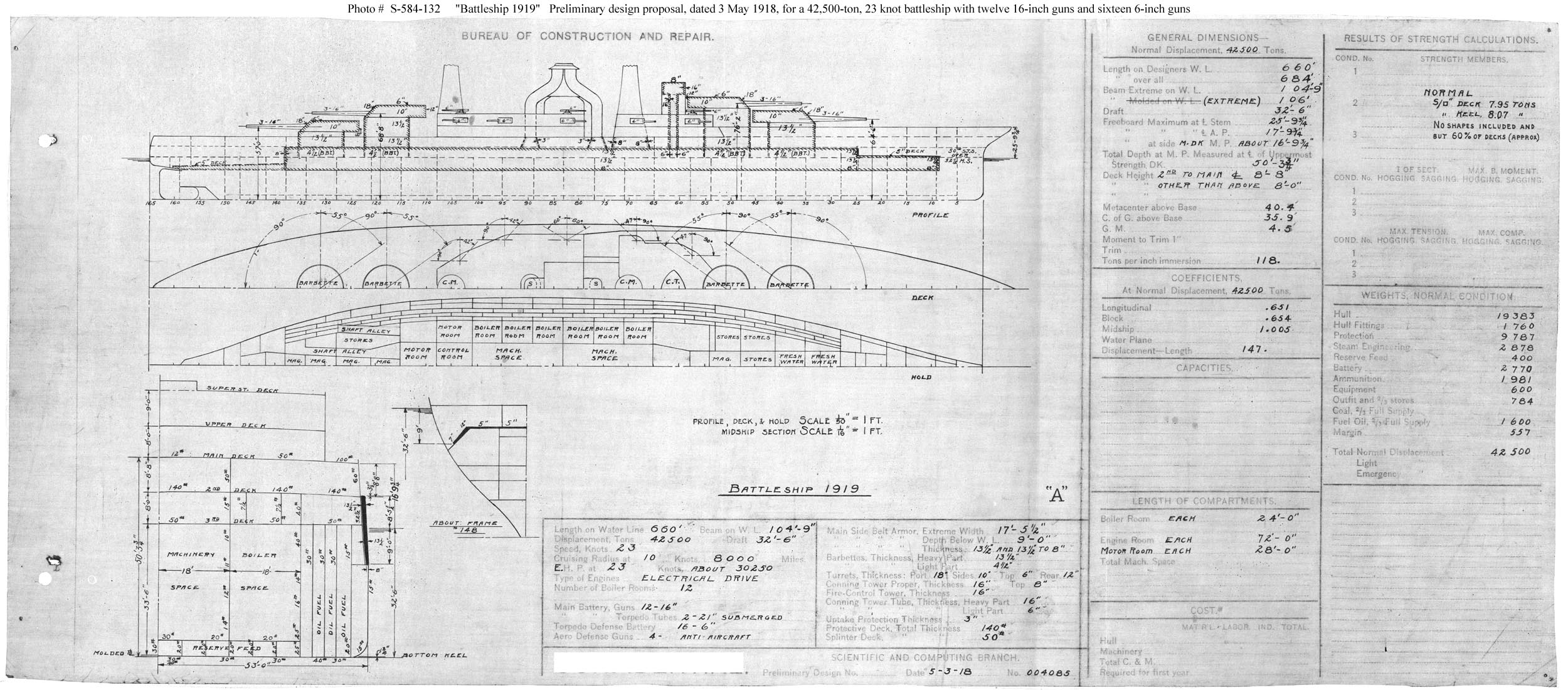 The first three ships built to this design were to have been laid down in late 1917. However, a few months after its entry into the war, the US suspended battleship construction to focus instead on vessels relevant to winning the tonnage war with the U-boats: destroyers, merchant ships, and the like. This resulted in more tweaks to the design, most notably replacing the 5"/51 guns with 6"/53s and making the turret tops thicker. More elaborate plans, most notably involving the use of sloped armor belts, were considered and discarded. The final result was a ship of 43,200 tons, a full 10,000 tons more than the Colorados, 684' long and very powerful, if a bit slow. Six ships were finally laid down in 1920 and 1921, suspended in February 1922, when the Washington Naval Treaty was being negotiated, and scrapped six months later. Five of the six names were reused for fast battleships during WWII, including the greatest vessel ever built. The sixth, Montana, was to be the lead ship of the follow-on class to the Iowas, but they also fell victim to cuts.