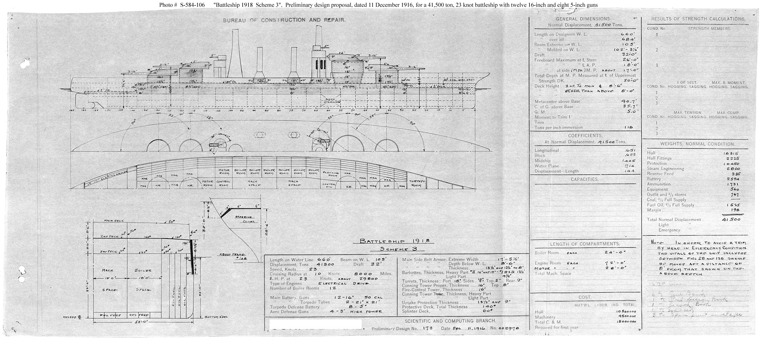Developments in battleships in Japan and Britain, particularly reports of the British 18" gun project, meant that the General Board, responsible for US ship characteristics, wanted a bigger and more powerful vessel. There was also an upward trend in battleship speed, so the initial characteristics were for a ship with 12 16" guns and a speed of 23 kts. Initial sketches with 6 twin turrets were soon discarded after successful firing trials with the triple turrets on the early Standards, and a new 16"/50 gun was developed to replace the 16"/45 used on the Colorados.1