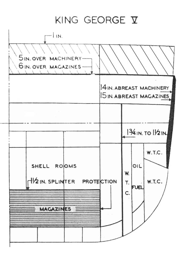 The final ship displaced about 37,000 tons standard and 42,000 tons deep as completed, which grew by at least 2,000 tons over the course of the war. 745 ft long, they were capable of 28 kts thanks to 110,000 SHP and four shafts, and had a range of about 5,000 nautical miles. The 14" guns fired a 1,590 lb shell at 2,475 ft/sec, with a maximum range of 36,000 yards at the maximum elevation of 40°. These were decent weapons, although they were the smallest guns mounted on any battleship built after the treaty, with the exception of the 11" on the German Scharnhorsts. The secondary battery of 5.25" guns was not particularly successful, as they were slow to traverse and slow to fire. The only area where the KGVs stood out was in protection. The vertical belt, 15" over the magazine and 14" over the machinery, meant that the inner edge of the immune zone against 15" shells was 13,500 and 15,600 yards respectively. The deck was designed to withstand both shellfire and armor-piercing bombs, with a thickness of 6" over the magazines and 5" over the machinery. This meant that 1000 lb bombs had to be dropped from above 15,000' and 10,500' respectively, while the outer edge of the immune zone was 33,500/29,500 yds. The heavy armor was rendered necessary by the belief that battles would be decided at relatively short range, probably 12-16,000 yards, despite improved fire control and the availability of air spotting. A lower belt was also fitted to counter the effects of diving shells. Their underwater protection, while designed against a 1,000 lb charge, was not particularly effective. It was only 13' deep, and the top opened up under the belt, allowing any explosion to vent inboard.