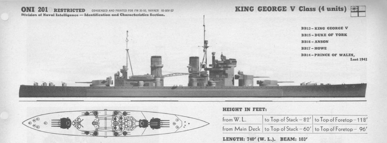 6 Originally, the last two were to have been named Jellicoe and Beatty, but this was changed due to potential political implications. Actually, the first three ships also have some interesting naming history. Traditionally, the first capital ship of a monarch's reign was named after said monarch, but the recent abdication of Edward VIII had made that impossible. Instead, ships were named after George V (recently deceased), Edward VIII, who had been Prince of Wales, and George VI, formerly the Duke of York. ⇑