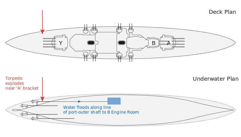 Did the first torpedo hit on Prince of Wales bend the outboard shaft all the way forwards to the engine room (in which case I'm surprised that the bending didn't cause the respective turbine to seize), or did the RN not bother sealing the shaft's bulkhead penetrations forward of the external shaft gland (in which case I'm surprised, to put it bluntly, that they'd be that stupid)?