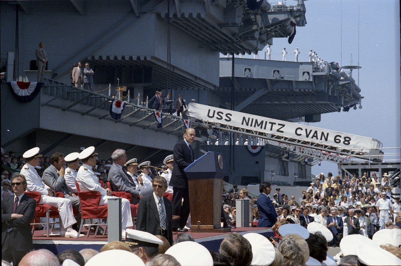 Then-President Ford speaks at the commissioning of the Nimitz