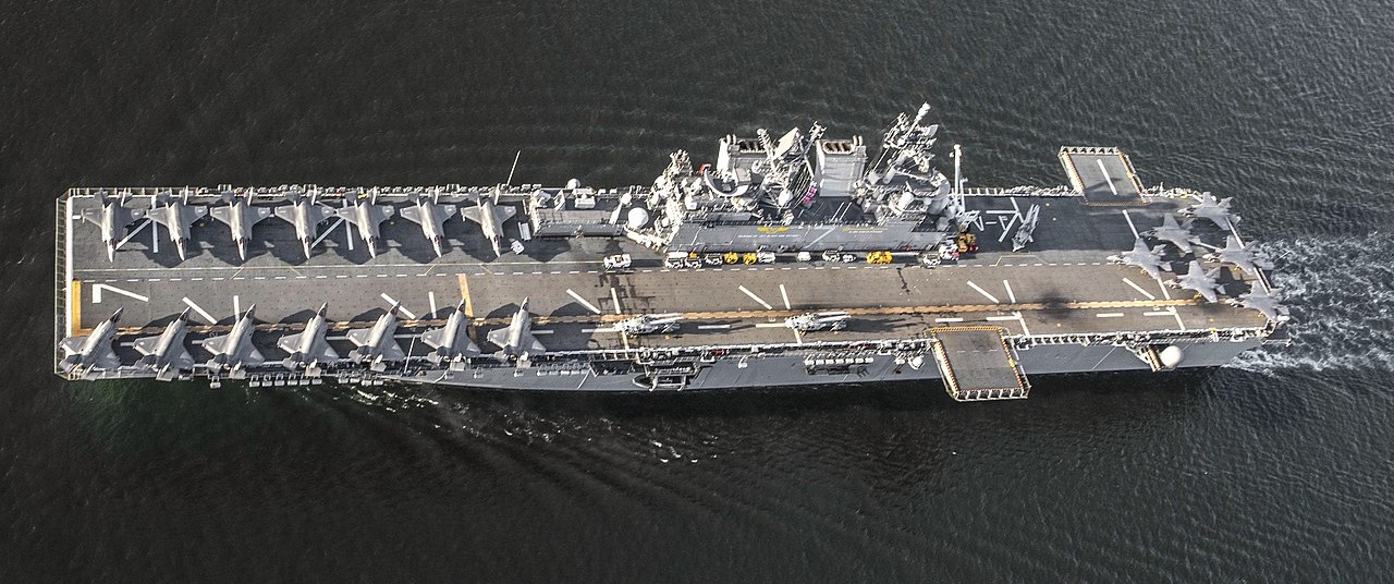 The USN is well aware of everything discussed above, and has a long history of fighting off attempts by various groups to downsize the carriers. In some ways, this makes the saga of the Americas surprising. The first two units of the class, America and Tripoli, were built without a well deck, to allow for a bigger hangar and more aviation supplies.6 This made them uncomfortably close to light carriers for the USN's taste, and it is rumored that making sure that Congress didn't get confused is the reason that the third unit of the class, Bougainville, got a well deck. Although tests with 20 or so F-35Bs have been carried out aboard Tripoli in 2022, the Americas are not particularly good carriers. Their design is definitely specialized for amphibious assault, with large areas for vehicle stowage and wide corridors for loaded Marines, which compromise survivability. Their magazines are set up to provide weapons for half a dozen F-35s operating in support of amphibious operations, less than 5% of the volume available on a Nimitz or Ford. Oh, and they're a lot slower than the proper carriers, capable of 22 kts instead of the 30 or so that the CVNs can make. This also explains the lack of a ski-jump. It would make them too similar to a real carrier, and take up valuable helicopter space during an amphibious assault.