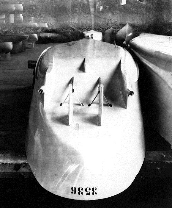 The unusual shape of the aft hull can be clearly seen on this towing tank model