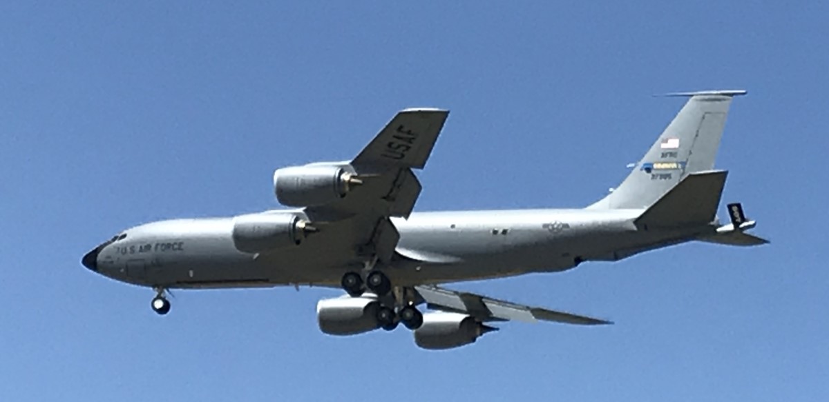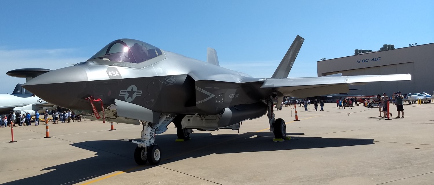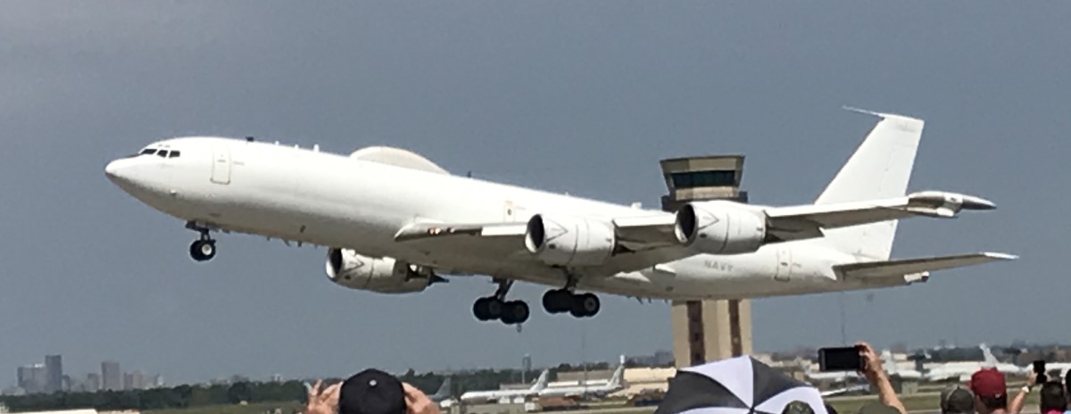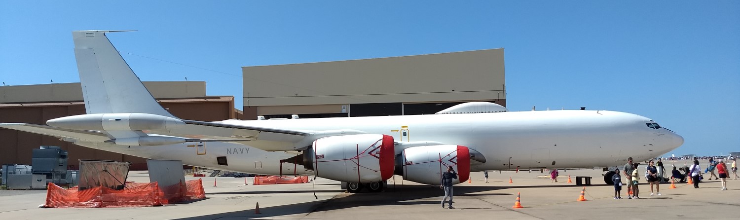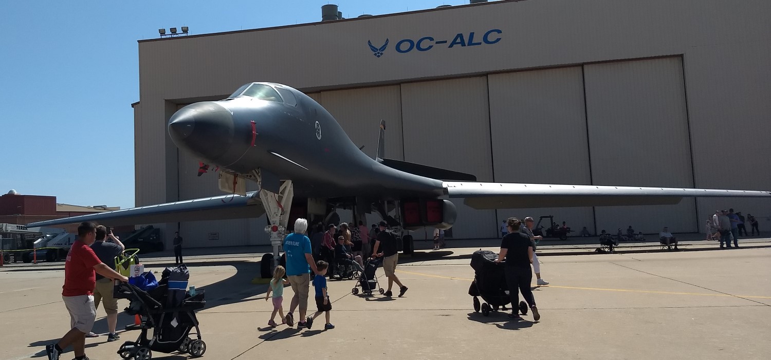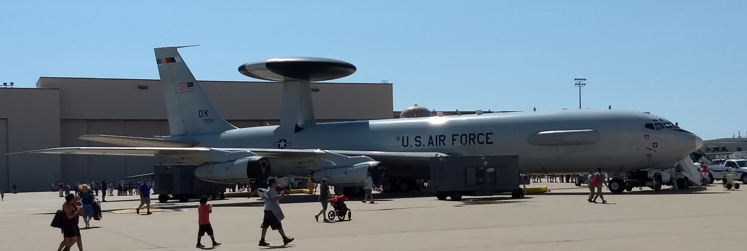 We got to the airshow at around 9:45 to get a chance to see the static displays before the flight demonstrations started at 11. They had one of basically everything operated out of Tinker parked on the ramp, and some things that weren't, including a KC-135, an E-6, an E-3, a B-1, a B-52, a C-17, and, weirdly, an F-35B. The KC-135, E-3 and C-17 were all opened up to the public, but the lines were incredibly long, so we didn't go into any of them. There are two ways to deal with this kind of line. You can either have multiple aircraft of a given type out on the ramp, like they did at Miramar, or you can move people through quickly. Unfortunately, they didn't seem to do either of these. I watched the exits of several of the planes, and people seemed to be coming out at the pace I would have expected if each group had a minute or two to talk to someone inside the plane. That's fine if you have a small event or if you have lots of planes open, but Tinker had neither, which meant a lot of time standing in the hot sun for visitors. We chose to instead look at the other static displays, which included everything from an F-16 to an MC-12 (the only plane we actually went inside) to a couple of Canadian trainers. There were the usual recruiting and vendor booths, but nothing particularly interesting. A highlight was when Lord Nelson, at my prompting and with me standing nearby hiding my hat, asked the Navy recruiter what it would take to get assigned to a battleship. He answered that she's have to go back in time about 20 years. (30, actually, but who cares.)
