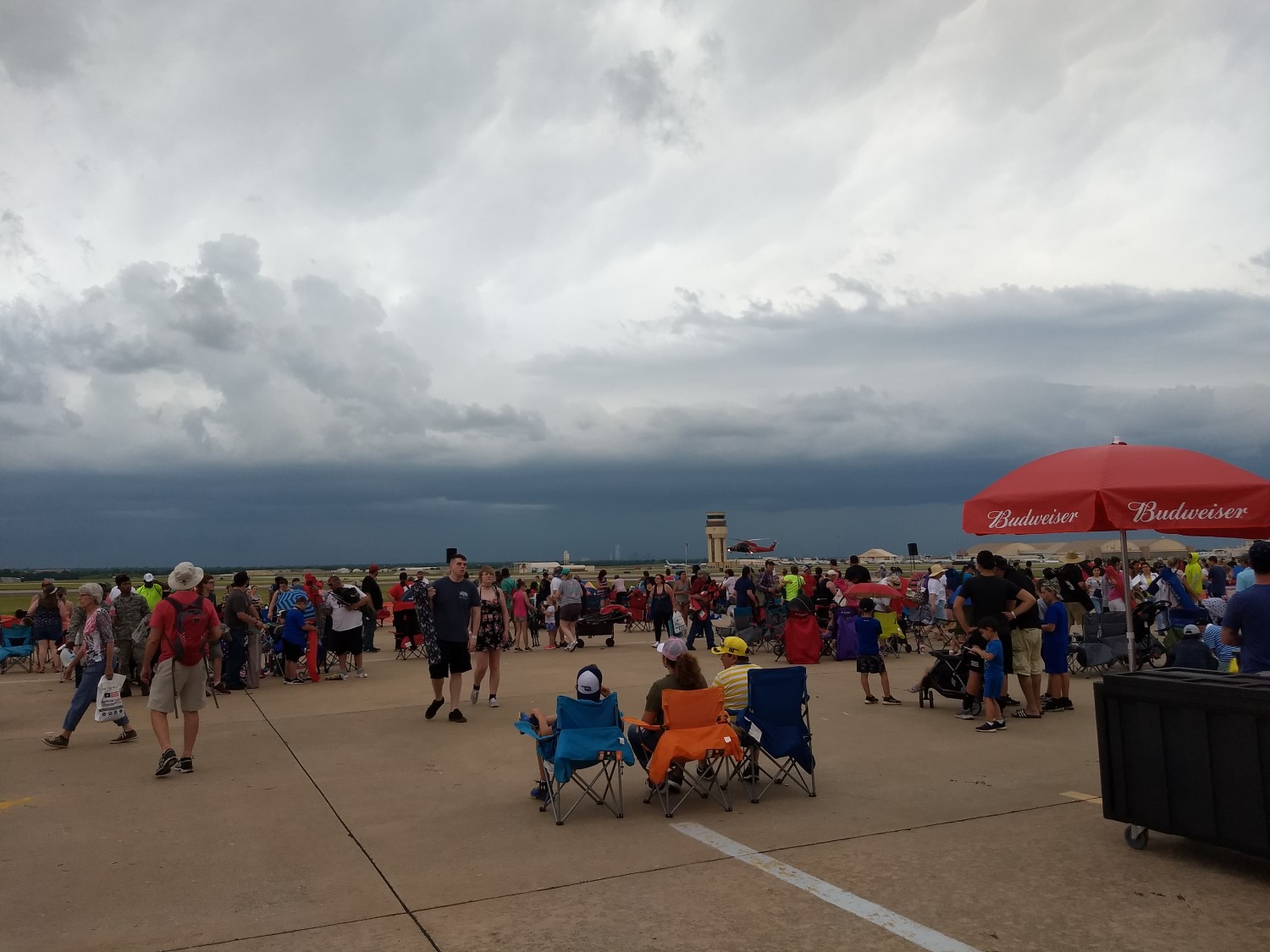 But as 2:00 approached, things began to get interesting as the northwestern horizon darkened.2 They suspended the show, and suggested that everyone seek shelter. I'd hooked up with a friend from church who worked at Tinker, so we planned to just go to his office, which would be more comfortable than the crowded hangars. Thanks to a series of mishaps that I'm not going to go into, we stayed in place too long, and were still heading for shelter when we saw a dust devil heading for us. The result was chaos. Kids were screaming about a tornado, and the wind was brutal. I was afraid I was going to lose my hat, and then have to abandon it because we really needed to get to shelter. But we made it before the rain started, and eventually ended up as quite possibly the most comfortable spectators on base.