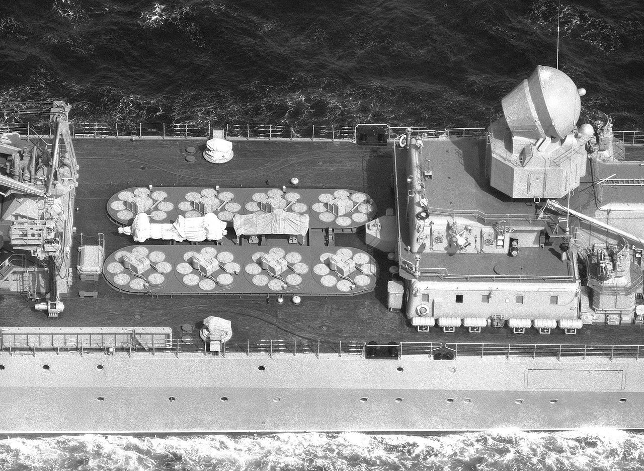 The Soviet system, used for the S-300F (SA-N-6) missile installed on the Kara and Kirov classes, was in many ways the more conventional of the two. It housed the missiles in an 8 or 12-round rotary canister under the deck, with the missiles rotating into a single launch position to fire. Upon launch, the missile was propelled up by a blast of compressed air, igniting its motor once it was 20 m or so up and well clear of the launcher. This was good for safety, as it meant that there was nothing high-energy inside the ship, and any failures would take place at a safe distance from anything important.1