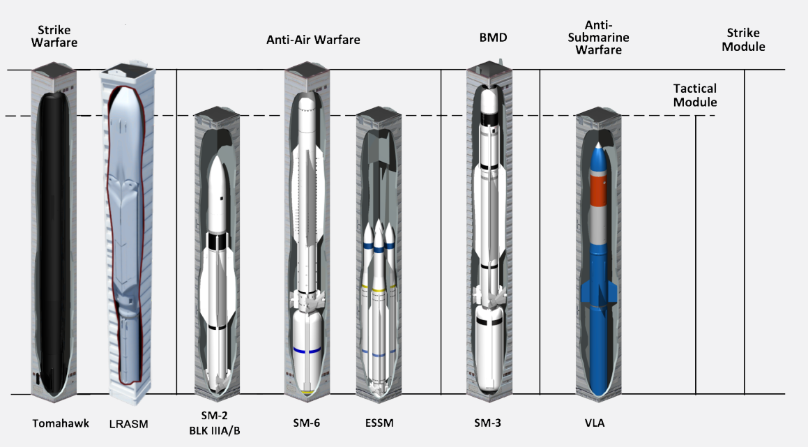 Instead of tightly wrapping a cell around Standard, the designers used the new Tomahawk as their template, producing a canister that was 25x25", with length varying by the type of missile, which in turn meant that Mk 41 systems came in three lengths. The shortest, known as self-defense length, was designed to carry Sea Sparrow and later ESSM. Longer was "tactical", which added the capability for Standard MR2 and the planned vertical-launch replacement for ASROC. Tomahawk, the longest of the initial missiles, required "strike length", although tactical canisters could still be fired thanks to the use of a spacer . Obviously, the longer cells are heavier, but also bring extra capability. Strike length is near-universal in USN service,3 while other nations use a mix of strike and tactical lengths, depending on their interests. Self-defense length appears to be defunct, probably due to the development of the specialized Mk 48, although some reports suggest that they couldn't handle ESSM Block II.