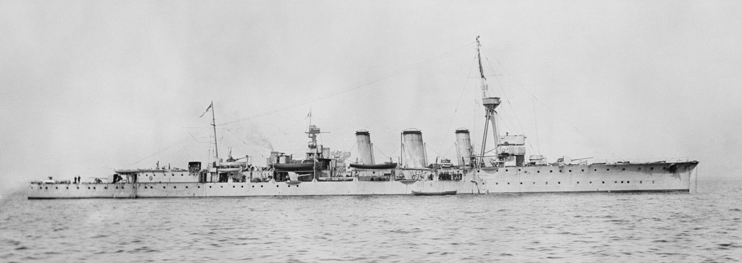 But neither the armored cruiser nor the battlecruiser could be procured in sufficient numbers for all of the duties required of cruisers. Trade had to be protected from merchant ships armed with light guns, battle fleets needed scouts, and destroyer flotillas had to be led. The result was the light cruiser, a vessel of maybe 5,000 tons with enough armor to be resistant to the light guns of destroyers, enough speed to keep up with them or close with and escape from an enemy battle fleet, and armed with 4"-6" guns in individual mounts. These ships were built in large numbers during the war, and some of the larger and more powerful examples set the stage for what came next.