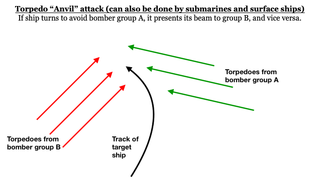 Also fairly slow was the torpedo itself, often not much faster than the target ship. A typical example was capable of about 40 kts and had a range of 1,500-2,500 yards. Firstly, this meant that the pilot would need to compensate for the speed of the target ship using a device known as a torpedo director. Even more importantly, a single torpedo would be fairly easy to dodge, the usual tactic being to turn towards the direction of attack to minimize the exposed width of the ship, a procedure known as "combing". The counter to this was to attack en masse, with the preferred method being to attack in two lines about 45° on either side of the bow, known as the "hammerhead" or "anvil". This would leave the target ship with no real way to avoid exposing its side to one attack if it tried to comb the other. If executed correctly, this was very effective, although aerial torpedoes were limited in size and warhead weight2 which meant that it typically took more than one hit to sink a ship. Per Striking Power of Airborne Weapons, a single torpedo was unlikely to sink even a destroyer, although two would likely put down anything smaller than a treaty cruiser. Three would probably be required for a carrier, while 4 or more might be needed for a battleship.3
