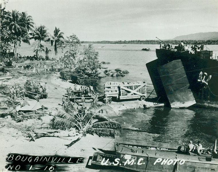 A Landing Ship, Tank unloading at Bougainville, Solomon Islands