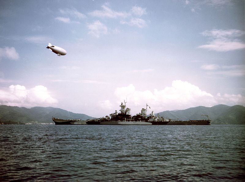 A blimp on patrol over the USS Missouri during her trials