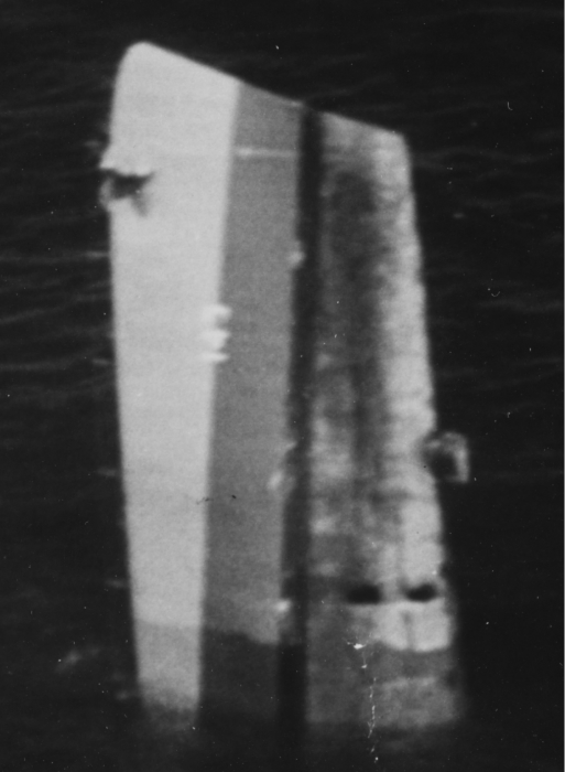 7 This was absolutely the only picture of a bow sonar dome I could find. The bow is floating vertically after it was blown clear of the stern. I apologize for the poor quality. Johan Larson suggests this photo of the sonar on an Oberon class submarine as an alternative. ⇑