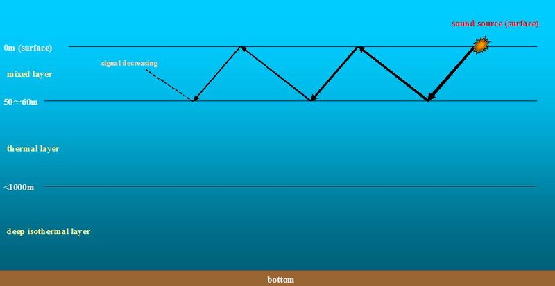 This effect wasn't all bad news for the hunters, though. Before the 50s, the only relevant phenomenon was the Surface Duct.6 This occurs in areas where the velocity was increasing with depth. Sonar beams will bend upwards, then bounce off the surface, assuming the surface isn't too rough, and go back down. This can greatly increase range over a situation with no gradients, as the energy is trapped in the duct. However, it also means that a shadow zone can exist below the duct, particularly if the gradient reverses. Submarines like to hide under this layer.