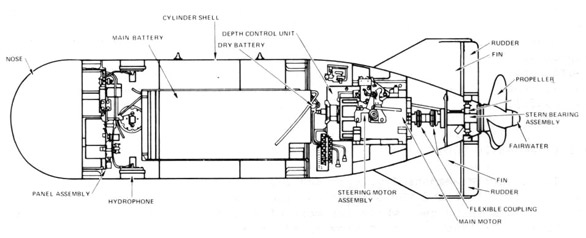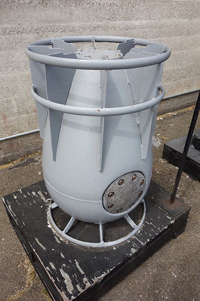 The most influential ASW weapon developed during the war was very different. It was an aircraft weapon, never used from surface ships: The Mark 24 mine. This weapon, also known as FIDO, was not a mine of any sort, and was only called that as a cover. It was instead an air-dropped homing torpedo, a truly remarkable weapon for the time. 19" in diameter and weighing 680 lbs, it was a viable substitute for the depth charges which had previously been the only option for aircraft attacking underwater targets. After being dropped into the water, it would circle, four hydrophones in the nose listening for the target. If it detected propeller sounds, it would steer towards them, attempting to equalize the signal between both the left-right hydrophone pair and the up-down hydrophone pair. The 340 torpedoes dropped by American and British aircraft were responsible for sinking 68 submarines and damaging 33 more, an incredible success rate for the time.
