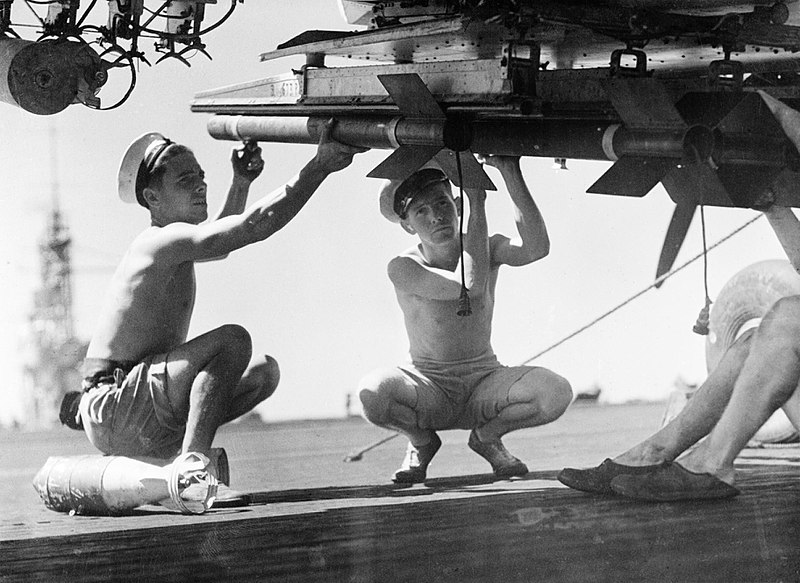 Rockets being loaded onto a Fairey Swordfish aboard an escort carrier