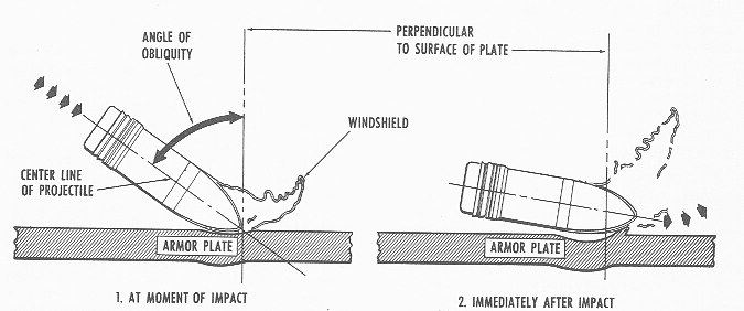 “How the armor and shell meet” boils down to impact velocity and obliquity, or angle of impact. A higher striking velocity is always going to result in higher penetration, all else equal. Obliquity is measured between the axis of the shell and the line normal (perpendicular) to the plate, so 0 obliquity is a direct hit and 80 degrees is a very glancing blow indeed. Oblique impacts have less penetration than direct ones, sometimes significantly so. This is not simply due to the geometry of the impact sending the shell through more metal, despite what most works that discuss armor penetration would have you believe. The front of the shell hits first, and the contact tends to make it rotate, either glancing off or hitting the armor side-first. This is obviously tremendously less efficient than a direct hit, and the usual counter was to design the projectile to dig in to the armor slightly, which would actually reverse this process. A shell hitting and piercing at high obliquity would come out with a lower obliquity than it went in at.2