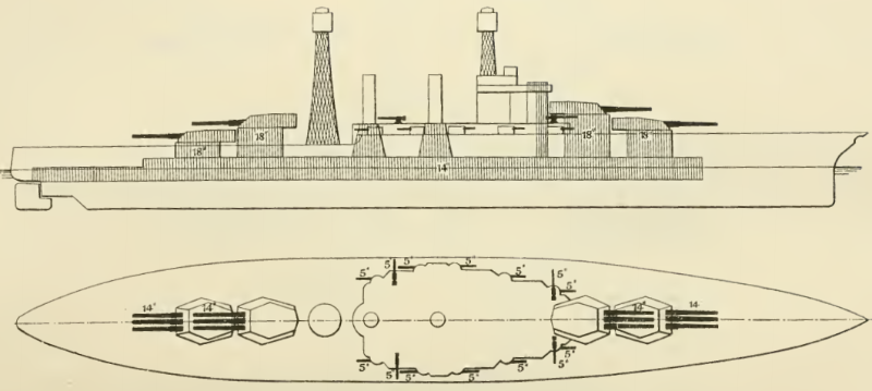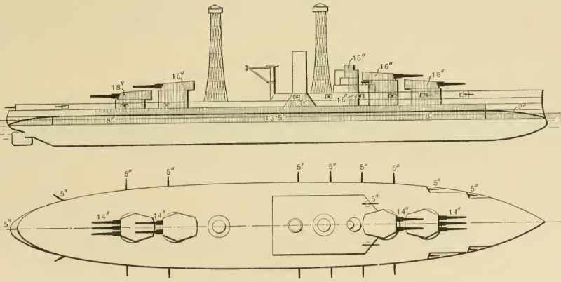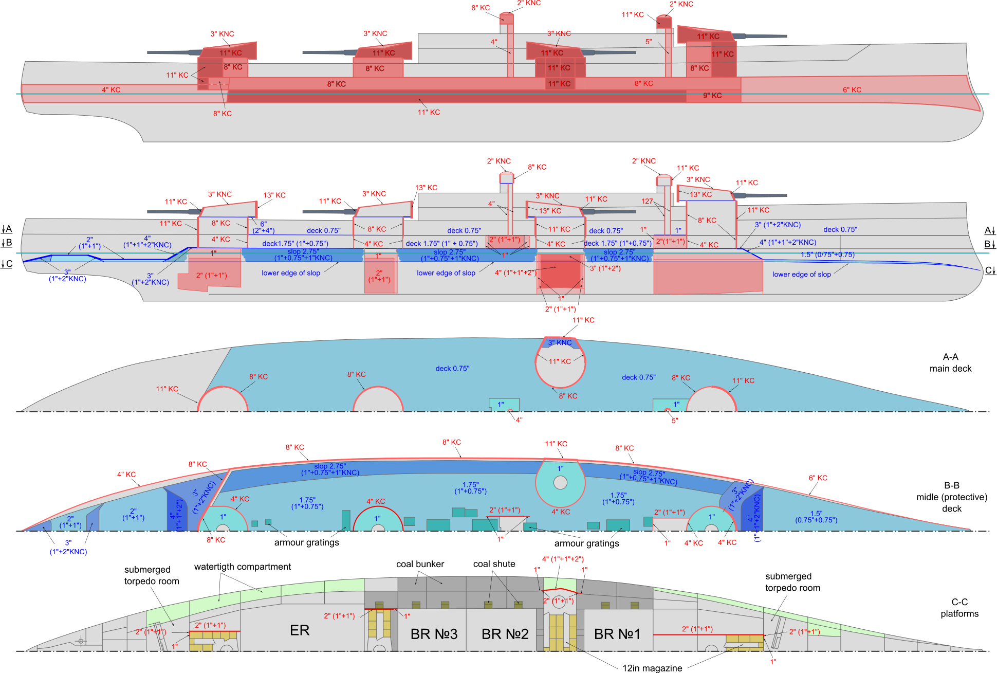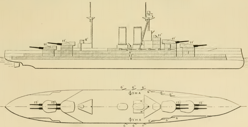 In 1911, the USN introduced a revolution in battleship armor with the Nevada class - actually two, although they're often mixed up. First, the USN was the first to appreciate the significance of recent improvements in fire control, and what that would mean for battle ranges. As such, emphasis went away from the belt armor and towards the deck.3 Second, the USN also figured out that recent improvements in AP shells would make them the dominant ammunition in fights between battleships. This removed the motive for the light armor employed against HC shells, and lead to the "All-or-Nothing" armor scheme, where the armor is either designed to resist heavy gunfire or not employed beyond splinter-plating thicknesses. This resulted in the elimination of upper belts, casemate plating, and thin belts at the ends.4