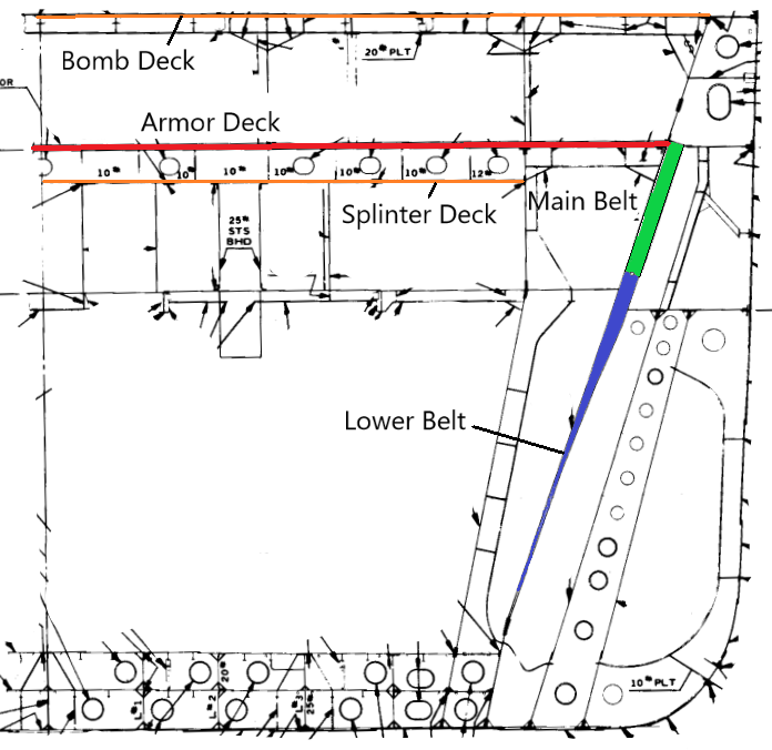 Iowa's deck protection is in three main layers. The main deck7 is 60 lb STS, and is called the bomb deck. The idea is to explode light-case HE bombs high in the ship, and start fuse action in AP bombs, hopefully detonating them before they reach the main armored deck.8 The 2nd deck is the main armor deck, 4.75” of Class B armor on 50 lb STS, intended to keep out shells and bombs. Directly below it is an mesh of empty compartments two or three feet deep, with a splinter deck of 25 lb STS closing them off below to catch any fragments knocked off the main armor deck.9