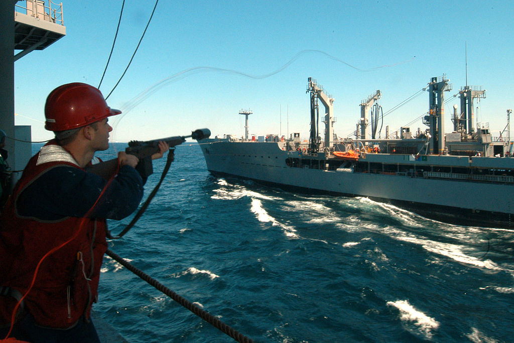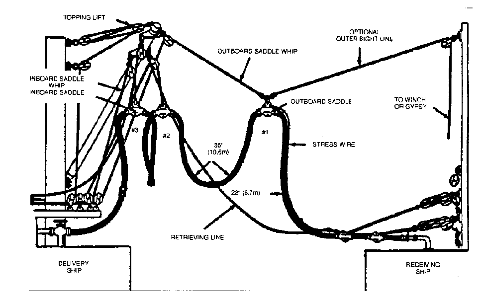 The first line, known as the Phone & Distance (P&D) Line, is fired across by a line thrower. This line is marked with flags every 20', making station-keeping much easier, and allows the bridge crews to talk to each other.10 After the P&D line is secured, the shotlines for the replenishment equipment follow. These are light lines, to which heavier messenger lines are attached and hauled over. These in turn allow the even heavier spanwires, which support the hoses, to be hauled across the gap between ships.