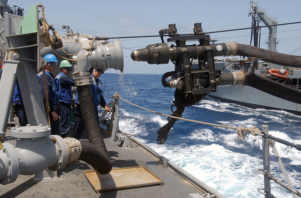 Once everything is hooked up, the two ships and their crews have to maintain their separation while the fuel flows. Modern equipment allows up to 180,000 gallons per hour to be pumped through each hose, although the situation in WWII was somewhat worse.11 At one point during WWII, the oiler Platte steamed next to Enterprise for 5.5 hours at night, separated by only 50'.