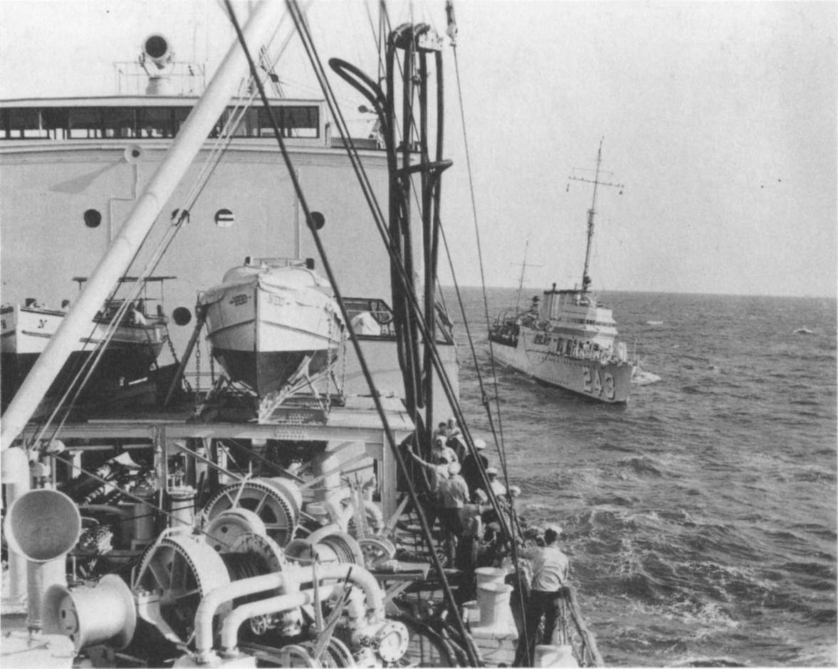These sorts of problems were soon overcome, and underway replenishment8 soon became a routine, if still somewhat tricky, operation. Today, it is still practiced in the same basic form, although there have been developments in technique.9 It begins with the oiler on a constant course at a steady speed. The ship to be refueled moves to a station a few hundred yards behind the oiler, and waits for its turn. On a signal, it slowly begins to overtake, staying a hundred feet or so clear of the other ship's side. This process takes 5-10 minutes.