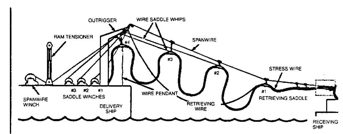 Diagrams of modern STREAM UNREP gear (top) and WWII-era close-in rig (bottom)