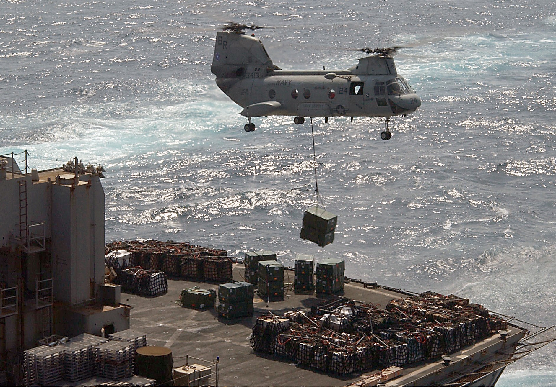 A CH-46 Sea Knight hoists a pallet of ammunition during a VERTREP