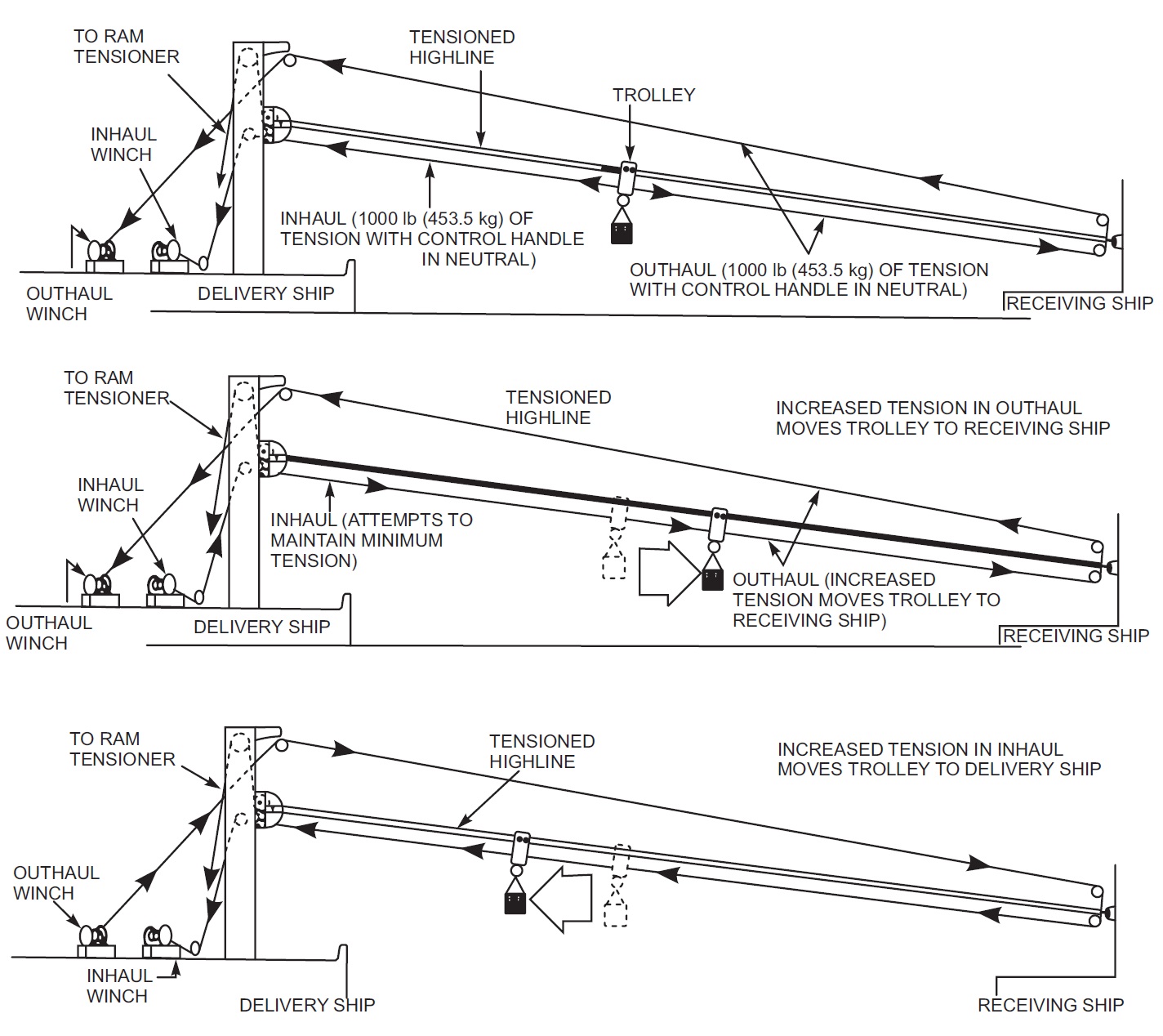 2 It should be noted that the concept of transferring cargo at sea wasn't totally novel. Highline transfers of men, mail, and small amounts of cargo were common. This method predated the war, and relied on the ship's crew to keep the tension in the line. However, the load limit was only a few hundred pounds, and an airstrike took a lot of 500 lb bombs. ⇑